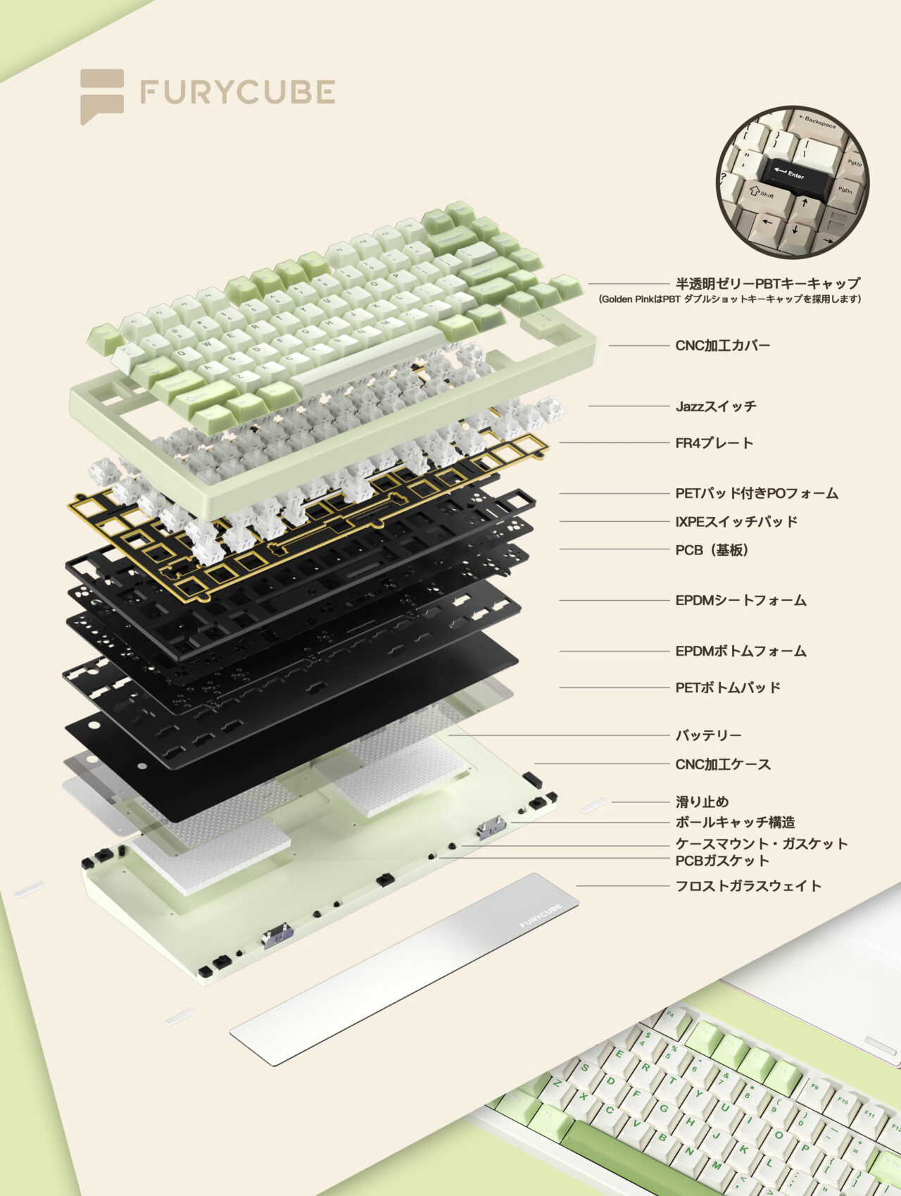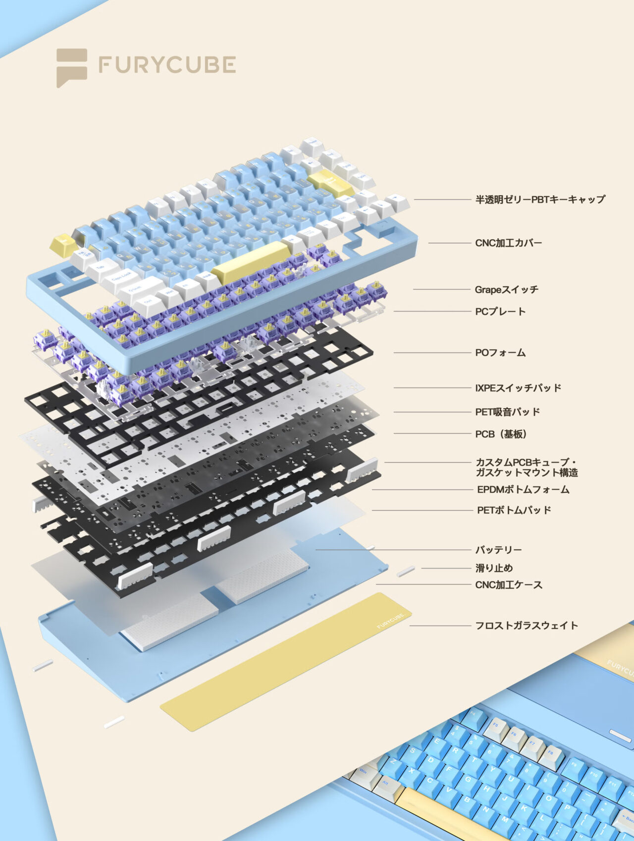 | FURYCUBE F75 Pro/Ultra | 75% JIS/US | メカニカル | 有線/BT/2.4GHz | 22,500〜30,000円 |