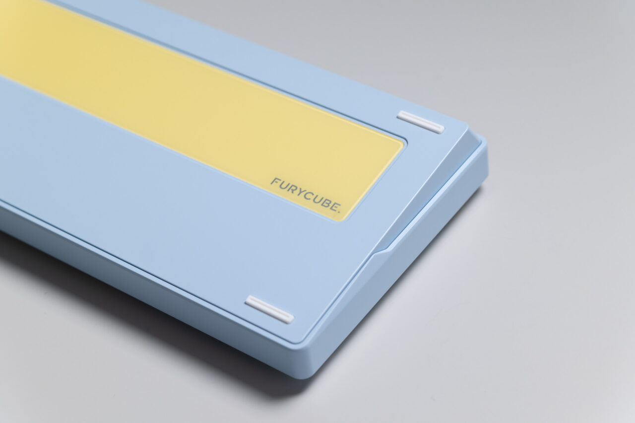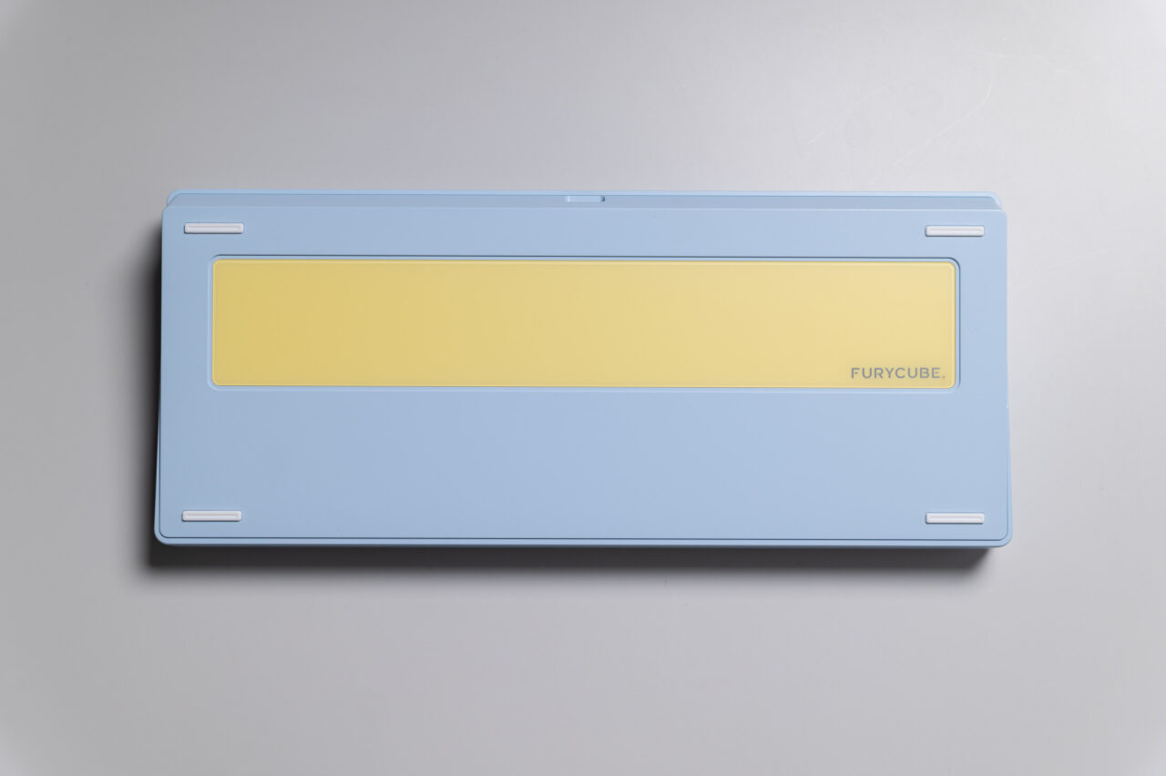 裏面のウェイトには、フロストガラスにシルク印刷を施した独自仕様が採用されています。FURYCUBEはガラス製品の製造背景を持つメーカーであり、この素材選択にはメーカーの強みが反映されているポイントです。アルミ削り出しのウェイトを採用するキーボードが多い中、ガラスウェイトの落ち着いた光沢と肌当たりの良さは独自性を感じさせます。