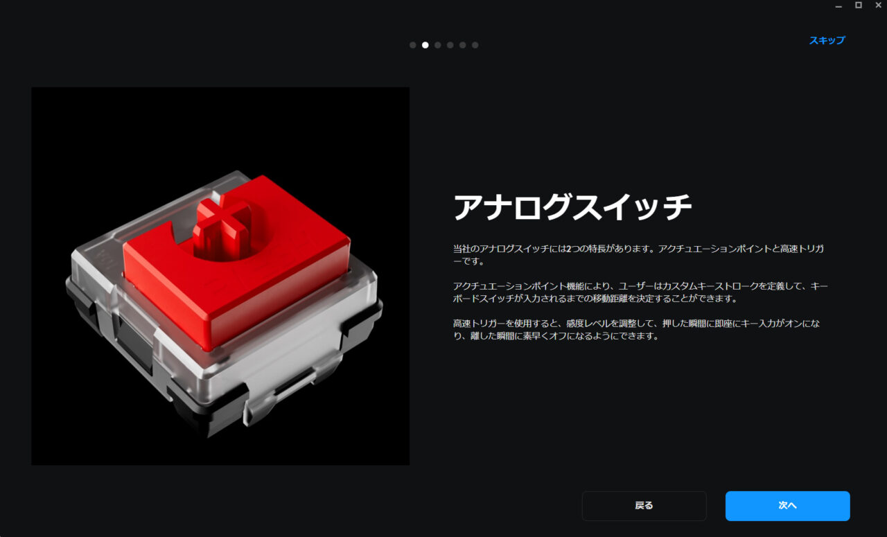 アクチュエーションポイントは0.1mmから2.5mmまで0.1mm単位で設定可能で、ラピッドトリガーは、0.1mmから1.5mmまで0.1mm単位で設定可能です。また、キーの優先順位を指定するいわゆるSOCD機能にも対応しており、ゲーム用途としての機能も備わっています。