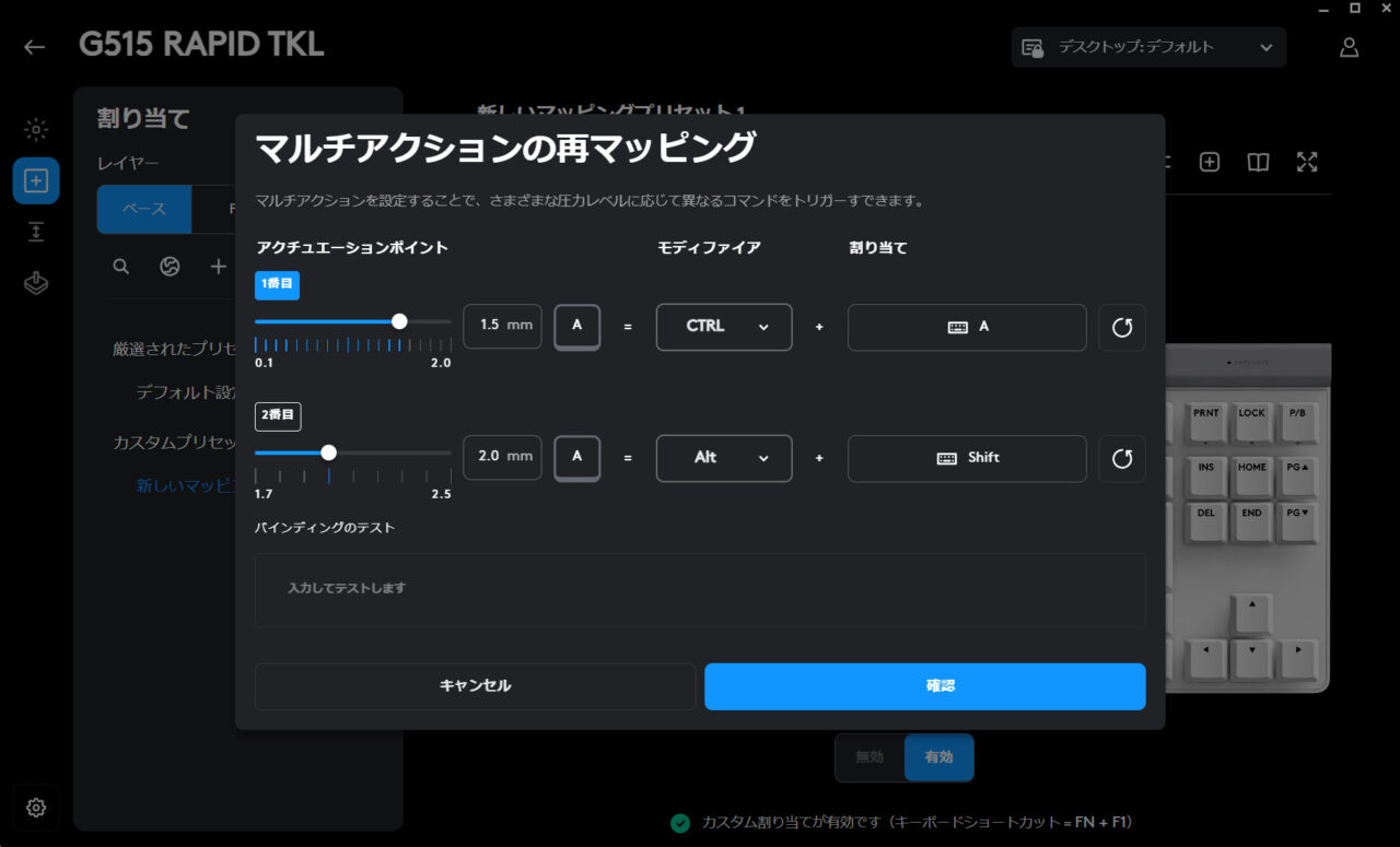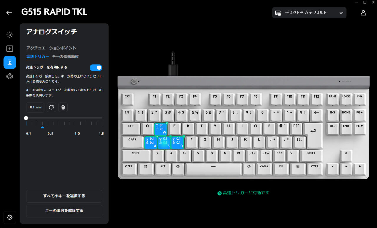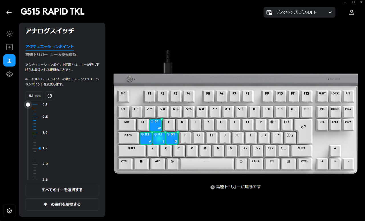 - ラピッドトリガー(高速トリガー)は、0.1mmから1.5mmまで0.1mm単位で設定可能