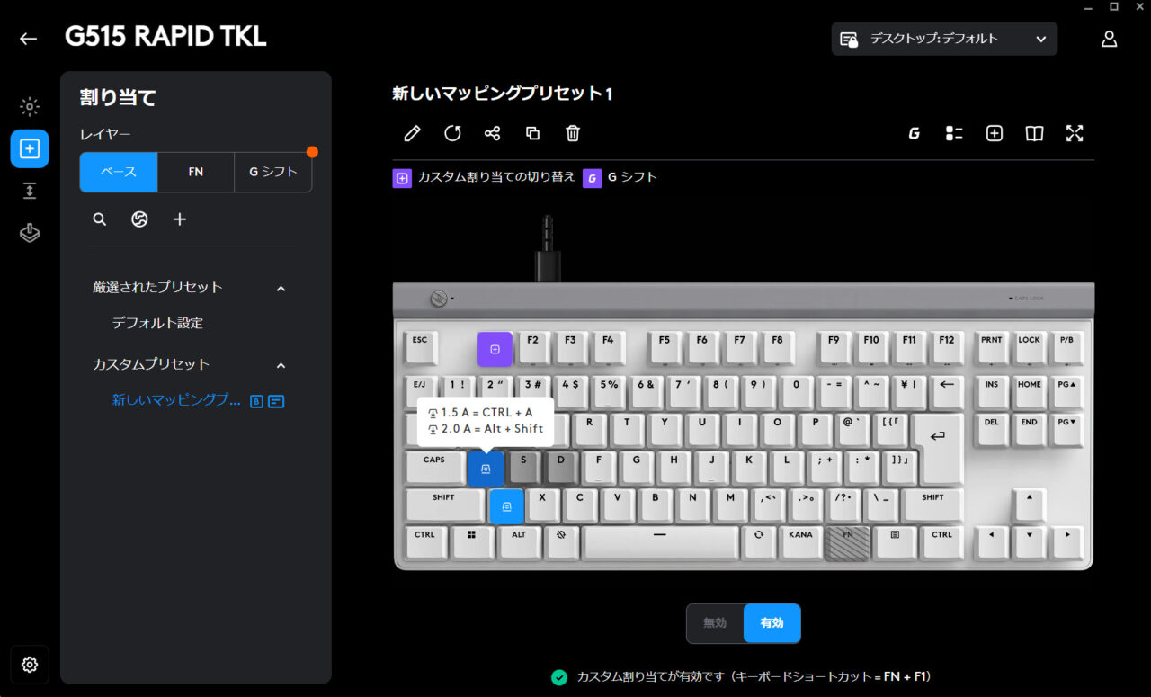 キー割り当て機能に関しても、各種キーマッピングのほか、3種類のレイヤーが使用可能。ベースに加えてFNキーレイヤー(FNキーを長押ししている時のみ動作するレイヤー)、Gシフト(特定の指定したキーを押している時のみ動作するレイヤー)など非常に細かなカスタマイズができる機能が備わっています。