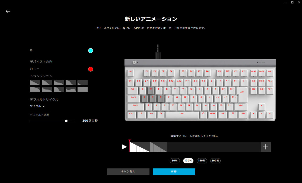まずライティングは綺麗なプリセットが9種類用意されており、さらに各キーごとの個別設定にも対応。ここまではよくある機能ですが、より動的なライティングのアニメーションプリセットも用意されているほか、トランジションパターンやフレームなどを細かく指定し、自分好みのアニメーションが作成できる機能も搭載されています。