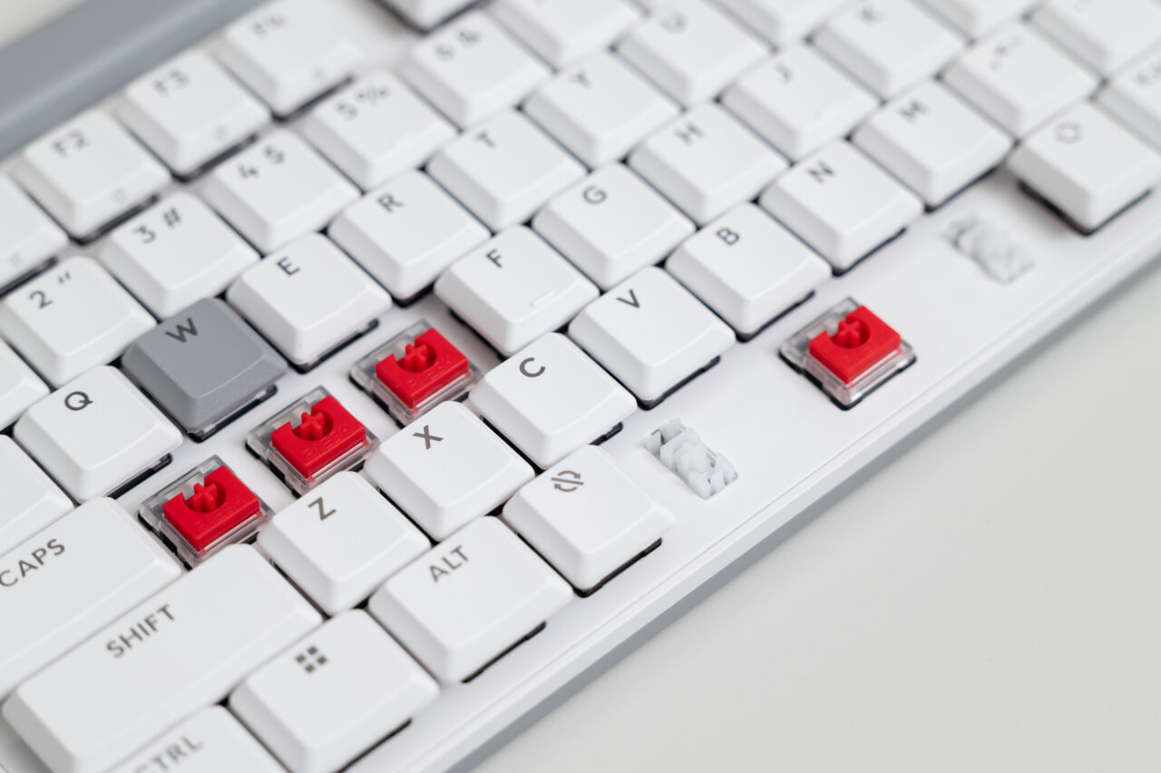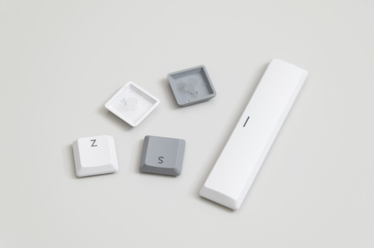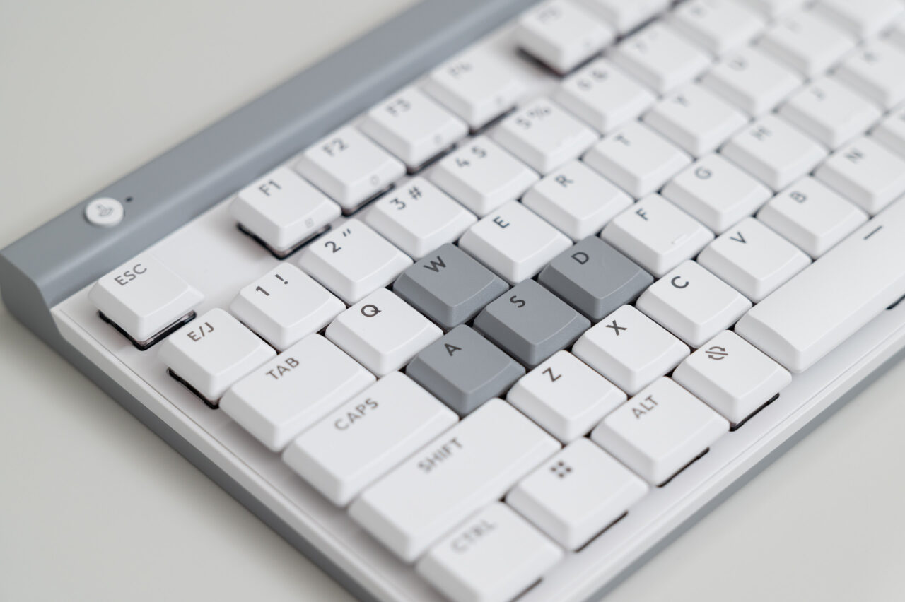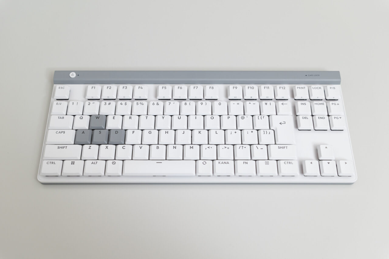 筐体はトッププレートがホワイト、背面・底面はグレーで統一されています。また、キーキャップの配色はWASDのみグレー、その他はホワイトと筐体同様にツートン仕様となっています。