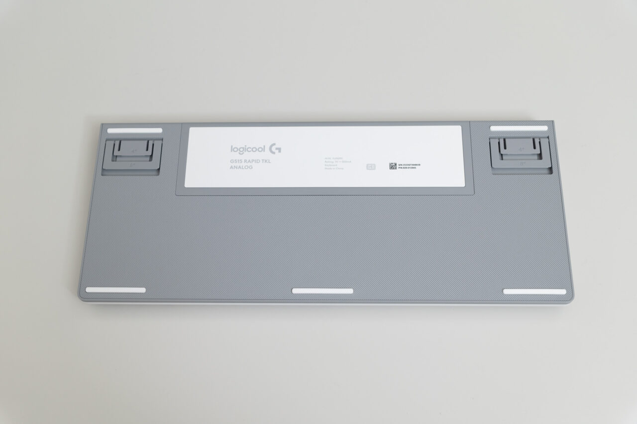 底面は樹脂製ながら、斜めの細かなテクスチャで見た目・触感ともにチープさはありません。滑り止めは下部3点・上部2点のゴム脚で、フリックや強めのキー操作でも筐体がズレにくい設計となっています。